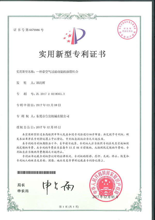 一種帶空氣過濾功能的油箱組合專利證書
